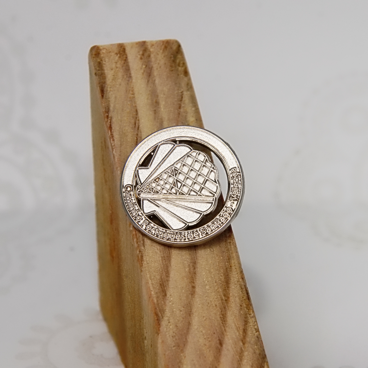 Este pin, prende com peça de encaixe na parte posterior. Indicado para colocar na t-shirt, chapéu ou mochila durante ou depois do caminho.